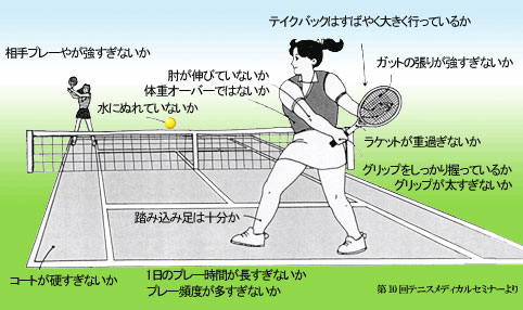 痛む部位により、「外側型」「内側型」「後方型」の3つに分けられ、最も多い外側型の痛みは、バックハンドストロークやバックボレーのインパクト時、日常生活動作では、タオルを絞る時、ドアのノブを回す時などに生じます。重症の場合は、箸も持てません。